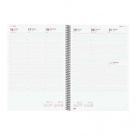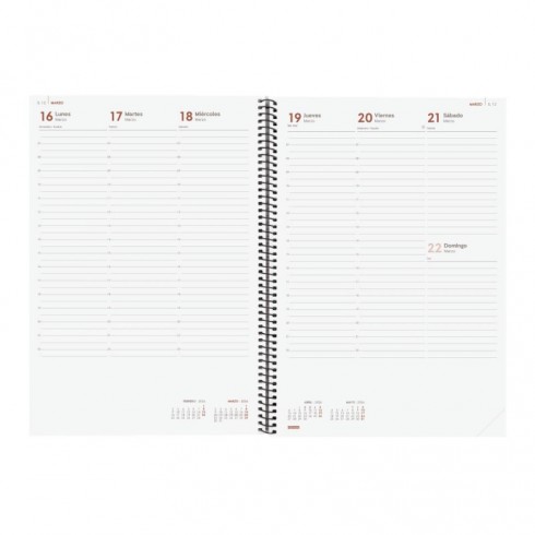 Agenda de espiral de estilo moderno. Con tapas de polipropileno y goma elástica. Ideal para uso personal y/o profesional. Con esquinas microperforadas para localizar rápidamente el día/semana en curso. La anualidad contiene la información útil relativa a: onomástica, festivos nacionales, cambios de estación, cambios de hora e inicios del nuevo año chino, musulmán, ortodoxo y hebreo. La agenda incluye otros contenidos extra.