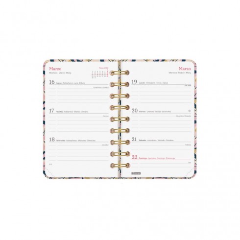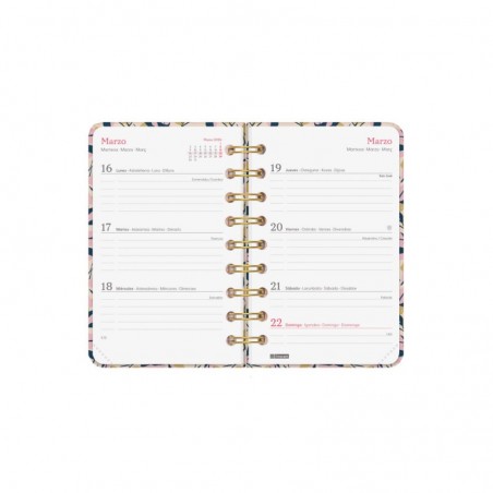 Agenda de espiral con tapa dura de cartón forrado con peliculado mate antirayaduras. Diseño elegante, en tendencia y a la moda, con detalles estampados metalizados. Ideal para uso personal y/o profesional. Con goma elástica. Con esquinas microperforadas para localizar rápidamente el día/semana en curso. La anualidad contiene la información útil relativa a: onomástica, festivos nacionales, cambios de estación y cambios de hora. La agenda incluye otros contenidos extra orientados a la organización personal.
