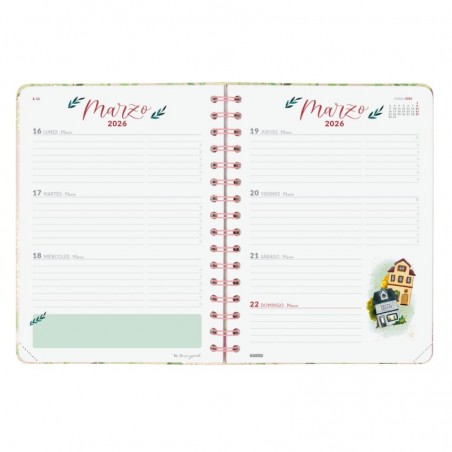 Fabricada con tapa dura de cartón forrado y peliculado antirrayaduras, espiral metálica doble y goma elástica, ofrece resistencia y estilo. Incluye esquinas microperforadas para encontrar fácilmente el día actual, además de adhesivos temáticos y dos marcapáginas para una organización personal aún más creativa.