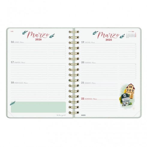 Fabricada con tapa dura de cartón forrado y peliculado antirrayaduras, espiral metálica doble y goma elástica, ofrece resistencia y estilo. Incluye esquinas microperforadas para encontrar fácilmente el día actual, además de adhesivos temáticos y dos marcapáginas para una organización personal aún más creativa.