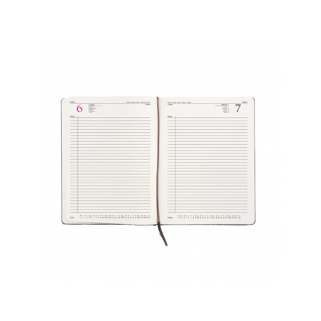 Agenda anual 2026, Encuadernada cosida con cubierta PVC tacto cuero. Estampación en relieve y guía interior de tela. 336 Páginas en papel marfil de 70 g. Interior a dos tintas.