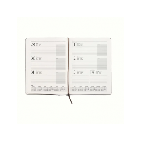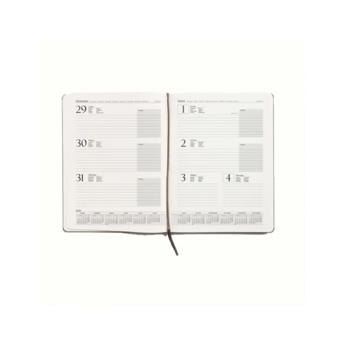 Agenda anual 2026, Tapas encuadernadas PU con cierre de goma. Estampación año en oro y guía de tela. 160 Páginas en papel marfil de 80 g. Interior a dos tintas.