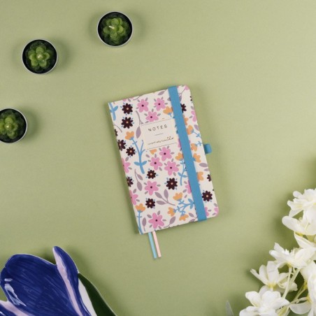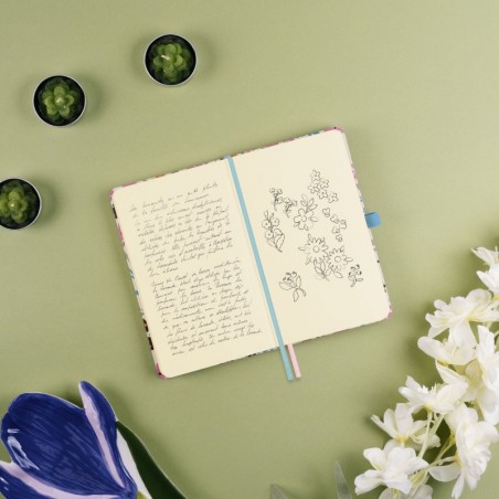 Cuaderno de tapa dura con diseño realizado en colaboración con la diseñadora e ilustradora Moniquilla. Con perfecta apertura para escribir cómodamente y bolsillo interior con fuelle de papel tejido muy resistente al uso. Hojas microperforadas para poderlas arrancar de forma elegante. Cierre con goma elástica, dos cintas punto y anilla portabolígrafo para llevar siempre contigo un elemento de escritura.