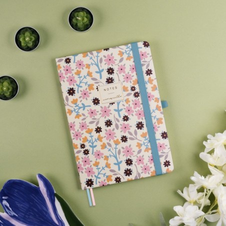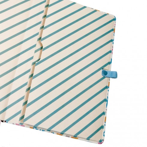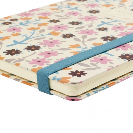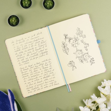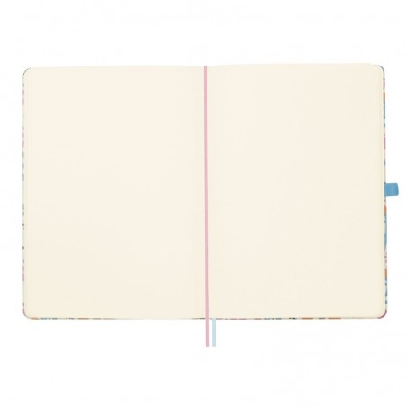 Cuaderno de tapa dura con diseño realizado en colaboración con la diseñadora e ilustradora Moniquilla. Con perfecta apertura para escribir cómodamente y bolsillo interior con fuelle de papel tejido muy resistente al uso. Hojas microperforadas para poderlas arrancar de forma elegante. Cierre con goma elástica, dos cintas punto y anilla portabolígrafo para llevar siempre contigo un elemento de escritura.