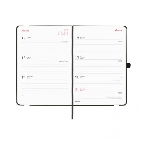 Contenido: Esta agenda incluye información relevante como onomásticas, días festivos, cambios de estación, días mundiales e internacionales, y los inicios de los años nuevos chino, musulmán, ortodoxo y hebreo. Además, cuenta con datos personales, calendarios, horarios, planificación anual y mensual con fases lunares, hojas para notas y contactos.