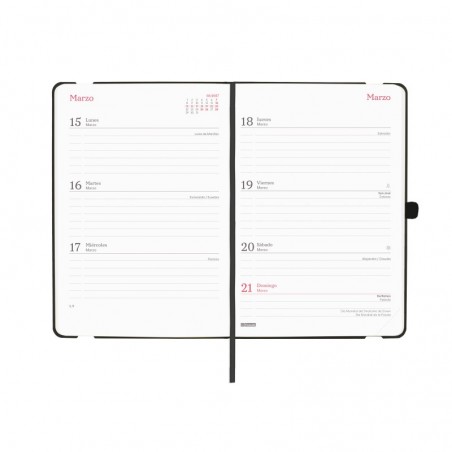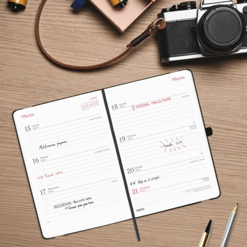 Agenda encuadernada de tapa blanda y flexible para 16 meses completos, desde septiembre de 2025 hasta diciembre de 2026. Incluye cinta punto y bolsillo interior con fuelle de papel tejido resistente, ideal para guardar notas y documentos importantes. Cuenta con goma elástica y anilla portabolígrafo para llevar siempre un elemento de escritura contigo. Su apertura perfecta garantiza una escritura cómoda y las esquinas microperforadas permiten localizar rápidamente el día o semana en curso. El diseño interior es limpio y práctico, con espacio suficiente para organizar proyectos, tareas y compromisos. Además, contiene información útil anual y otros contenidos extra para una mejor organización personal. Con formato similar a DIN A5, combina la portabilidad de una agenda de bolsillo con la funcionalidad de una de sobremesa.