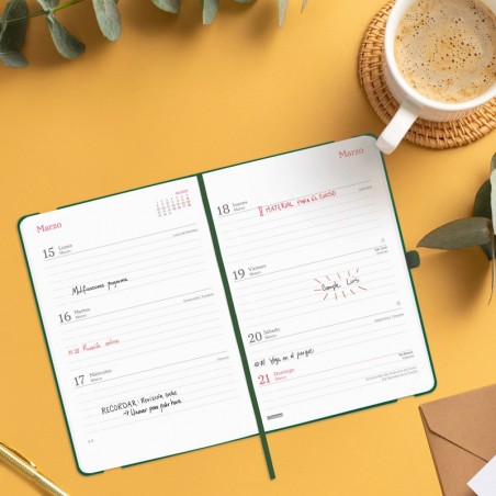 Contenido: Esta agenda incluye información relevante como onomásticas, días festivos, cambios de estación, días mundiales e internacionales, y los inicios de los años nuevos chino, musulmán, ortodoxo y hebreo. Además, cuenta con datos personales, calendarios, horarios, planificación anual y mensual con fases lunares, hojas para notas y contactos.