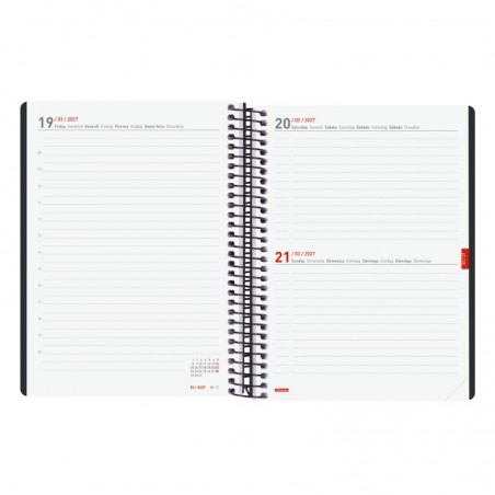 Agenda de espiral de tapas ligeras de polipropileno reciclado, procedente de residuos y polución del mar. Ideal para avanzarse en la organización del año natural con 16 meses completos: inicio en septiembre de 2026 y finalización en diciembre de 2027 Con goma elástica y esquinas microperforadas para localizar rápidamente el día/semana en curso. Idioma internacional.
