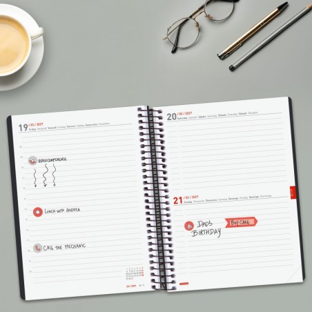 - Contenido: La anualidad de la agenda incluye la información relativa a festivos. La agenda dispone también de otros contenidos extra: datos personales, calendarios, fechas a destacar, códigos de países, mapa de los husos horarios, festivos internacionales, tallas de ropa, horario, cosas que hacer, plan mensual en columnas de 3 años, plan mensual a cuadros de 16 meses, hojas para anotaciones, hojas para contactos y set de adhesivos temáticos.