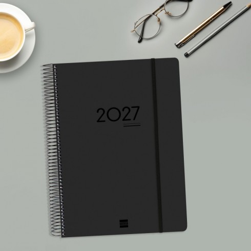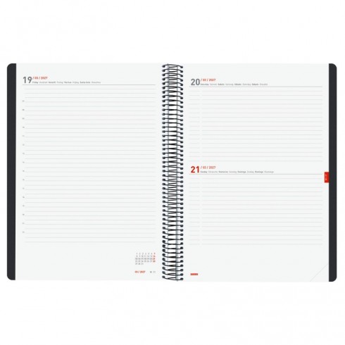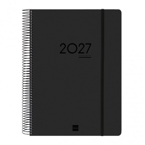 Agenda de espiral de tapas ligeras de polipropileno reciclado, procedente de residuos y polución del mar. Ideal para avanzarse en la organización del año natural con 16 meses completos: inicio en septiembre de 2026 y finalización en diciembre de 2027. Con goma elástica. Idioma internacional.