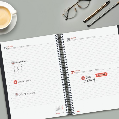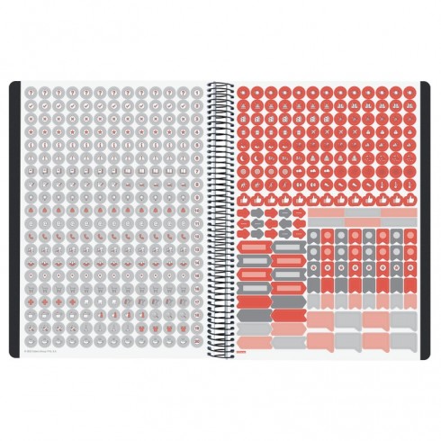 - Contenido: La anualidad de la agenda incluye la información relativa a festivos. La agenda dispone también de otros contenidos extra: datos personales, calendarios, fechas a destacar, códigos de países, mapa de los husos horarios, festivos internacionales, tallas de ropa, horario, cosas que hacer, plan mensual en columnas de 3 años, plan mensual a cuadros de 16 meses, hojas para anotaciones, hojas para contactos y set de adhesivos temáticos.