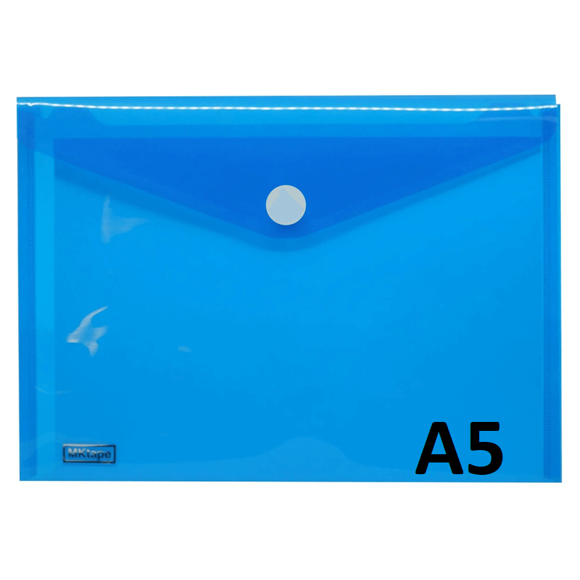 Sobre porta documentos tamaño A5 de polipropileno translúcido con acabado mate impermeable. Cierre con velcro.