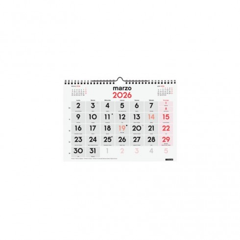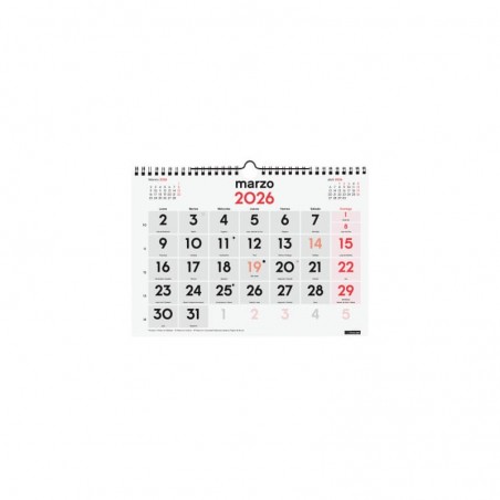 Calendario anual de pared con números grandes para una visión rápida del mes. Con mes anterior y posterior en cada página. Encuadernado con doble espiral y con colgador.