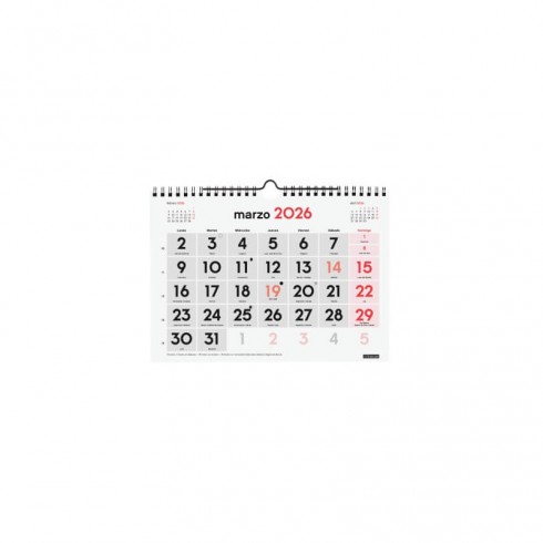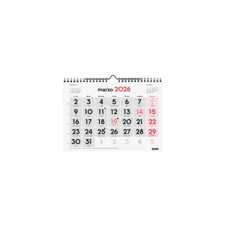 Calendario anual de pared con números grandes para una visión rápida del mes. Con mes anterior y posterior en cada página. Encuadernado con doble espiral y con colgador.