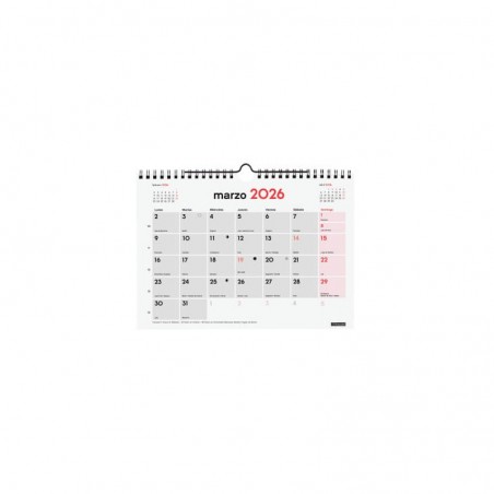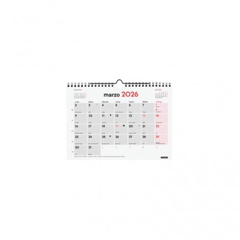 Calendario anual de pared con números grandes para una visión rápida del mes. Con mes anterior y posterior en cada página. Encuadernado con doble espiral y con colgador.