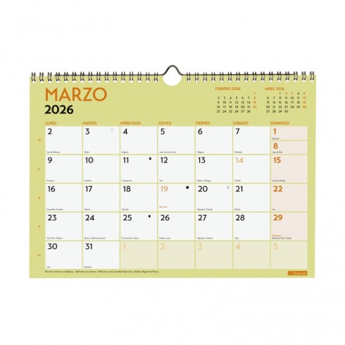 Calendario anual de pared a todo color encuadernado con espiral doble y con colgador. Con un toque moderno para aportar un ambiente casual a tu organización. Contiene información útil y de interés, espacio diario para anotaciones y con mes anterior y posterior en cada página. Perfecto para planificar tus días. Ideal para la oficina o el hogar.