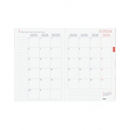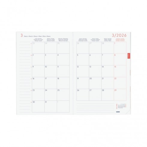 Planificador de sobremesa muy ligero y liviano que permite una planificación mensual de todo el año. Con un pequeño espacio para anotaciones en cada mes. Encuadernado con grapa. Con tapa ligera de cartón forrado con peliculado mate. Papel de alto gramaje. Con esquinas microperforadas para localizar rápidamente el mes en curso. Para facilitar la localización de cada mes, la anualidad dispone de un indicador en la parte derecha de las páginas. El planificador incluye contenidos extra.